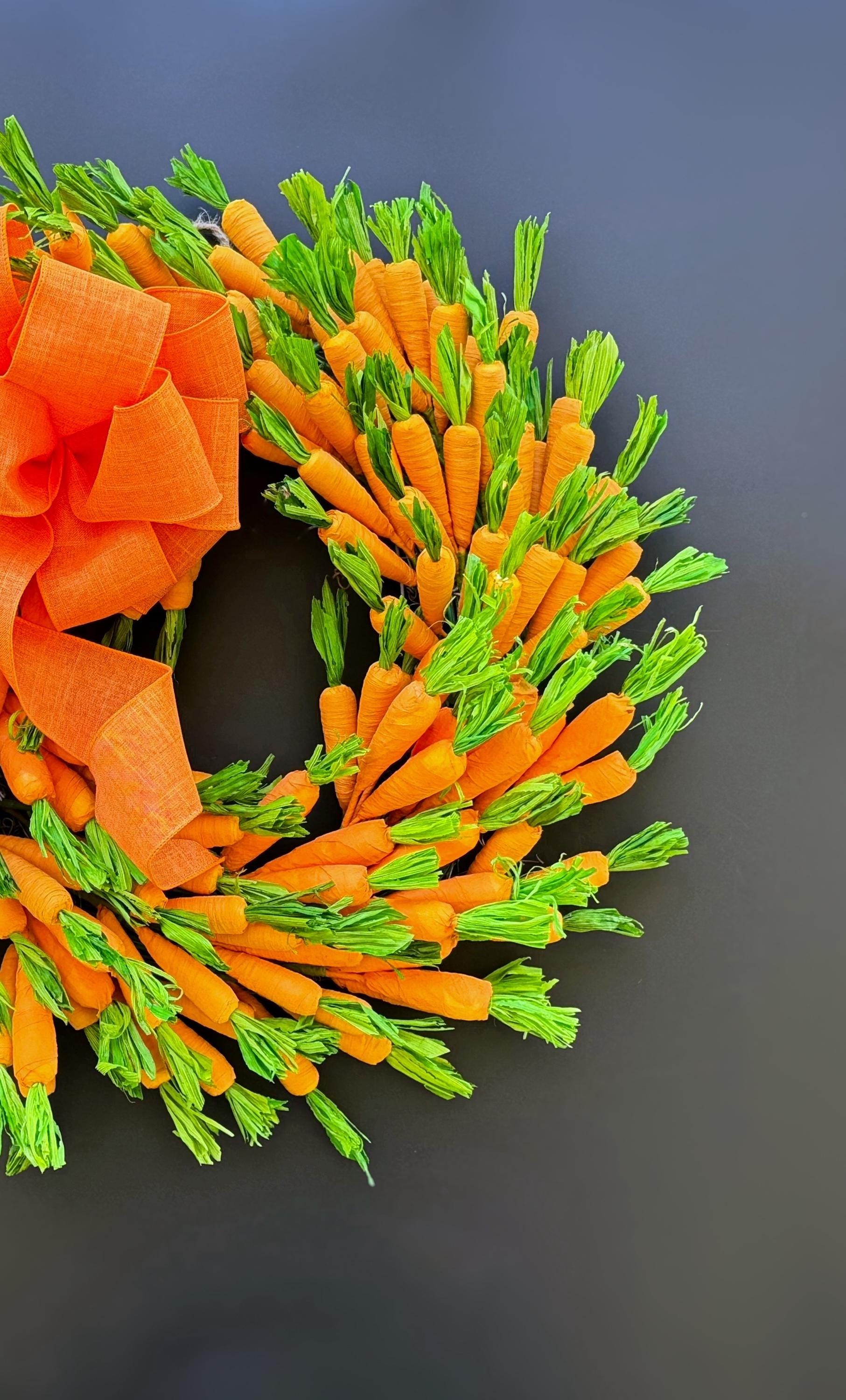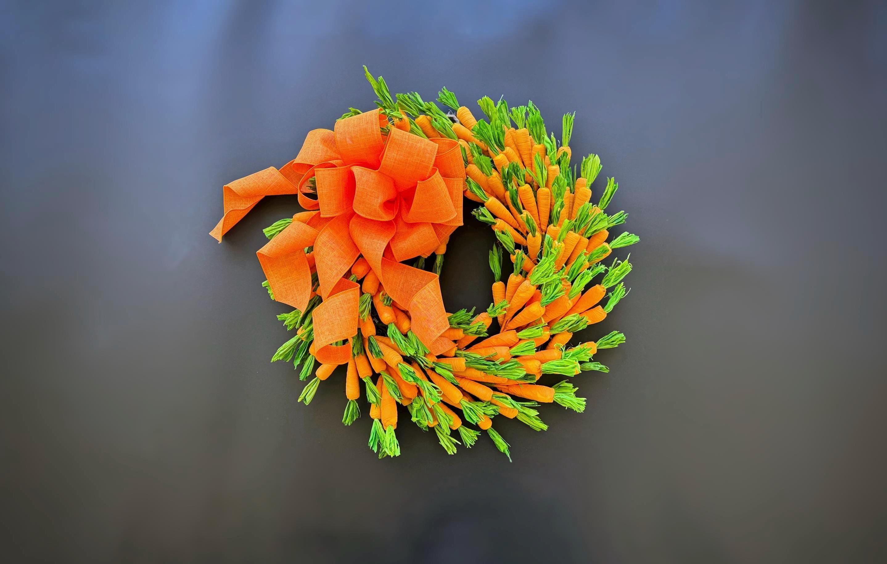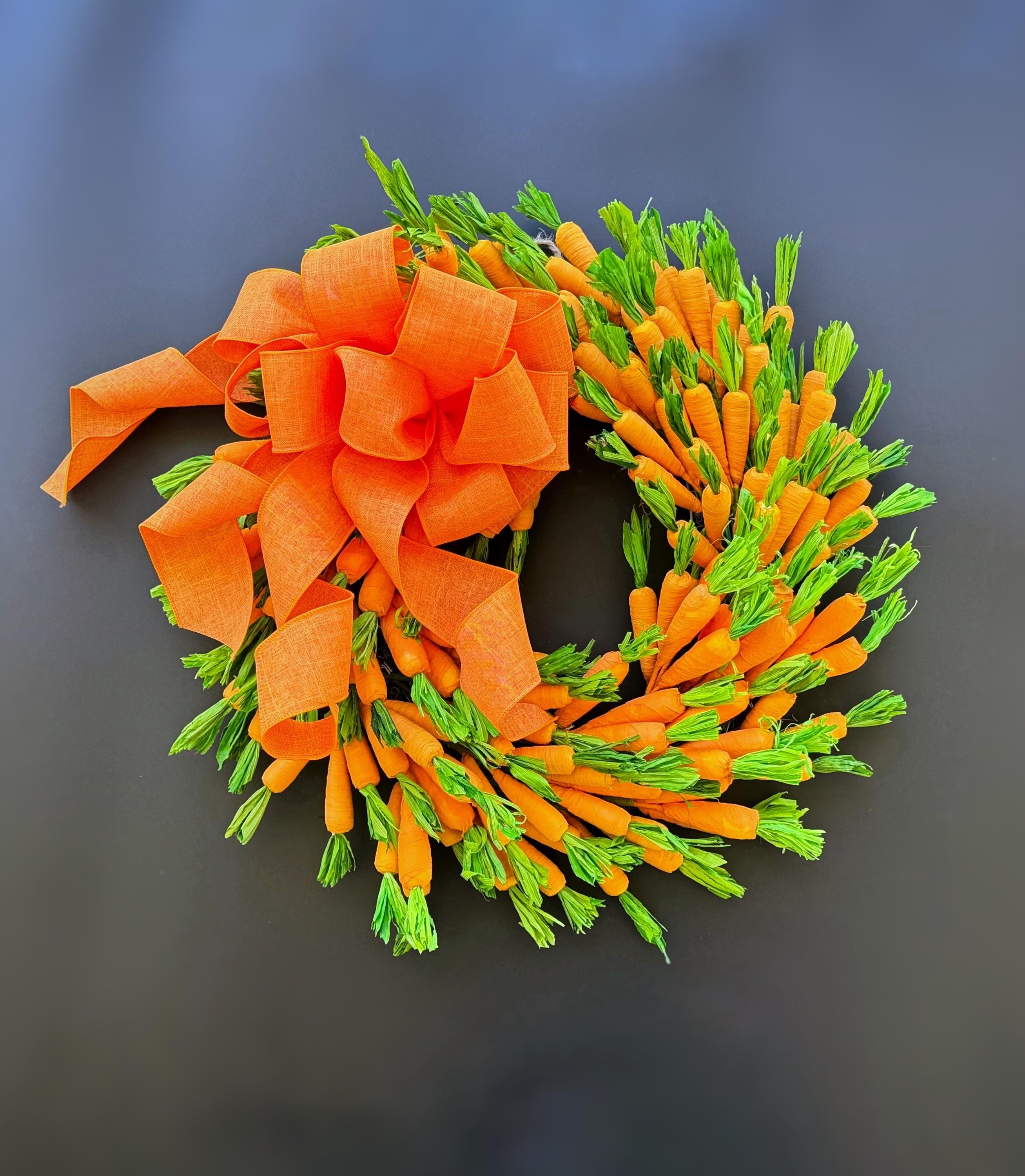 Dozens of orange and green tissue paper carrots adorn this wreath. A beautiful orange bow added to the wreath makes it pop.