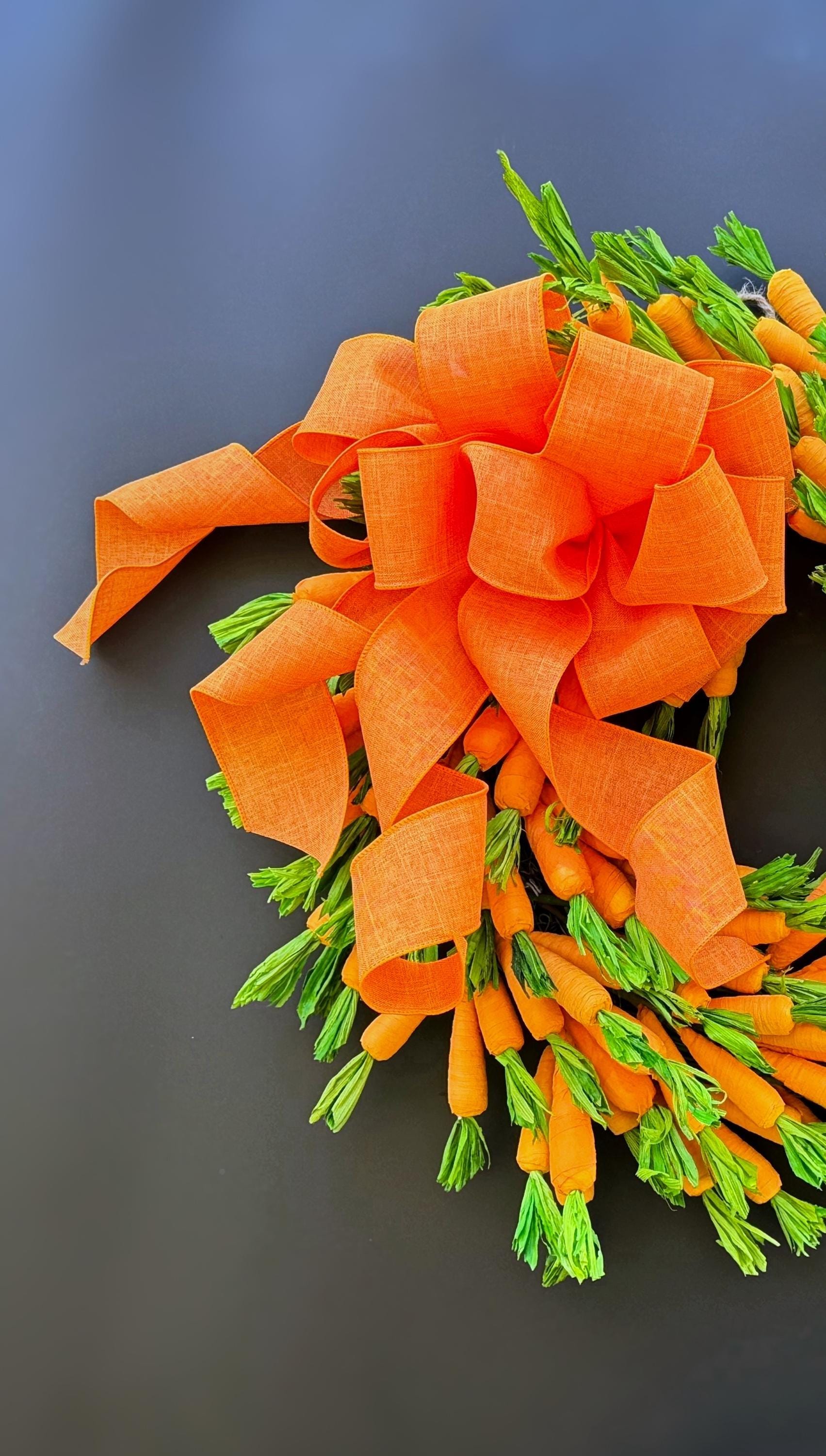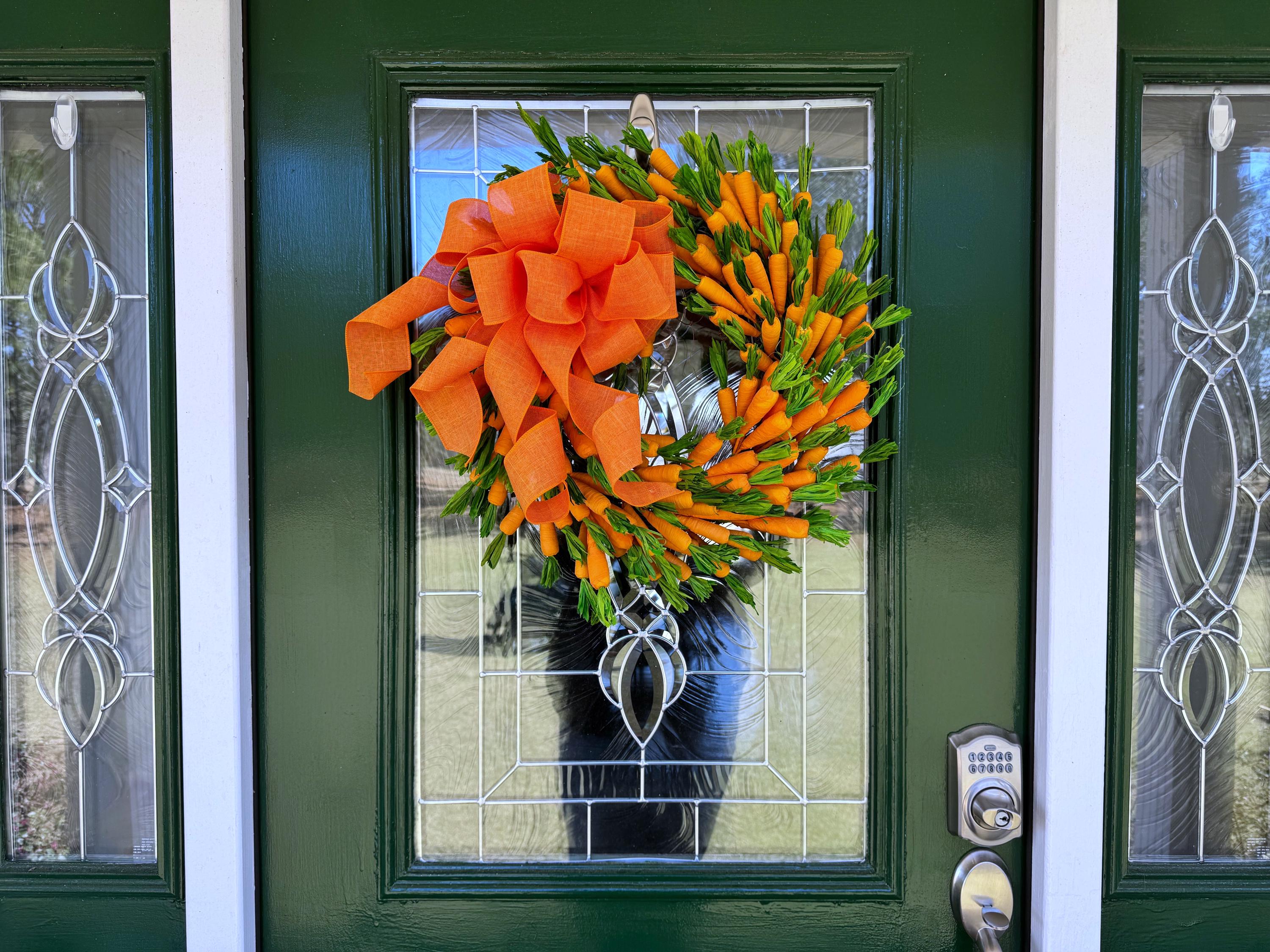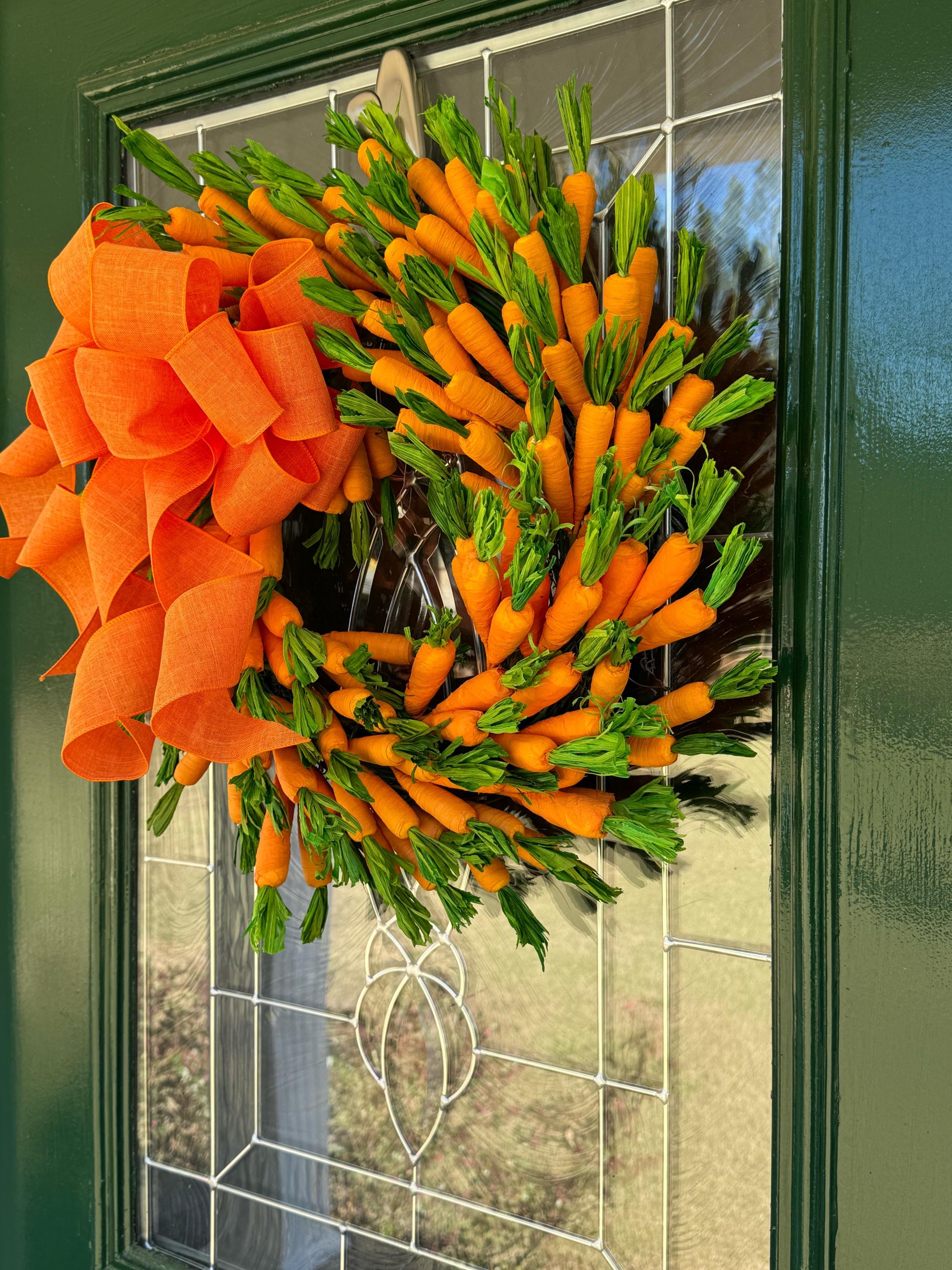 Dozens of orange and green tissue paper carrots adorn this wreath. A beautiful orange bow added to the wreath makes it pop.